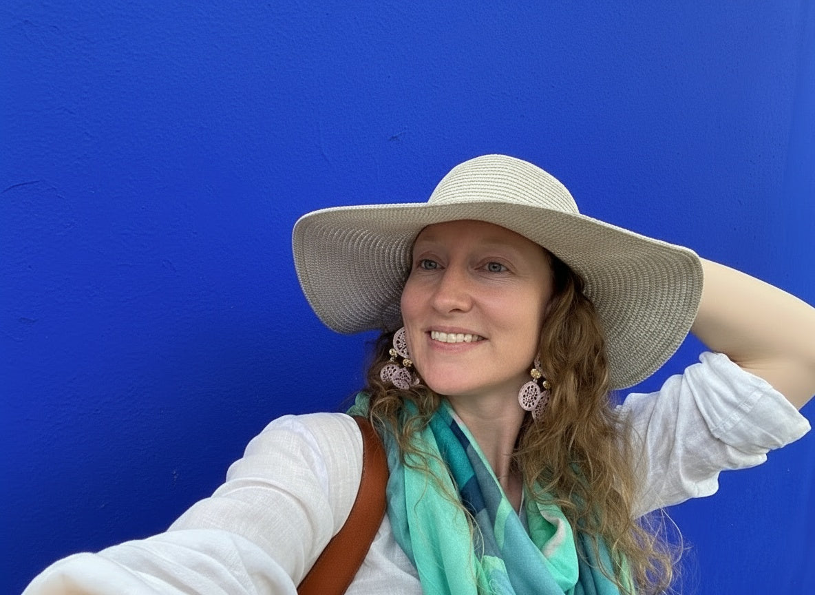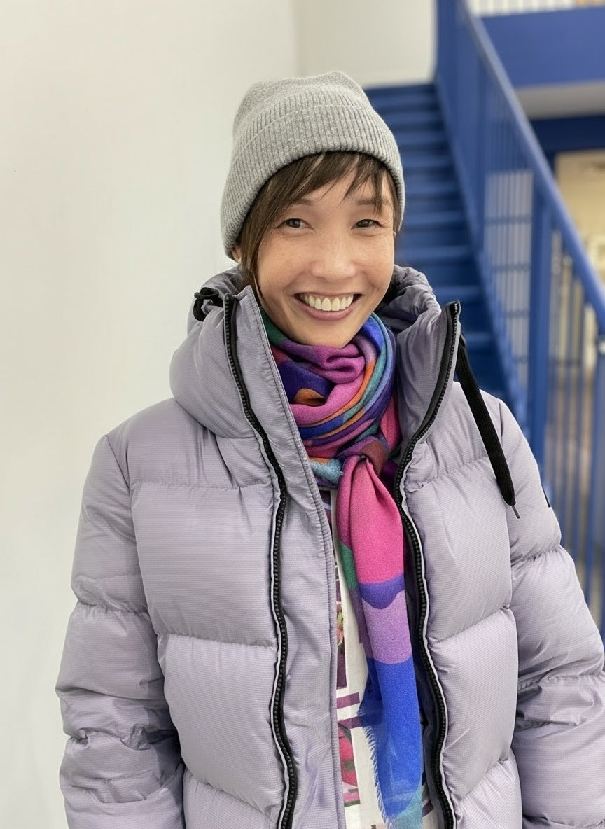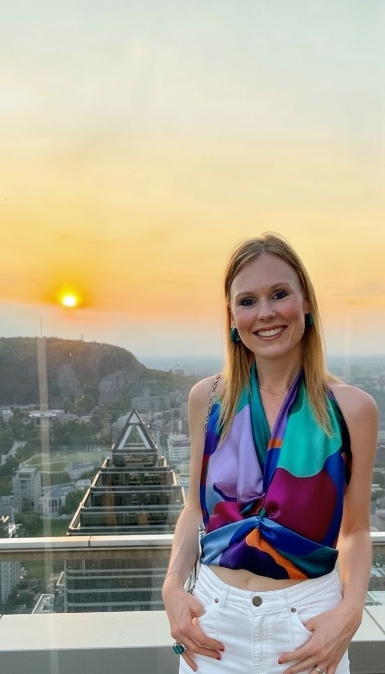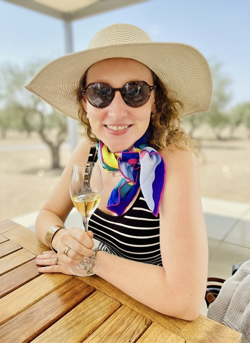 Each scarf begins with a hand painted oil painting created by artist Dominique Czerednikow, whose work is inspired by the wild, beautiful vibrations of life. Her passion for colour, movement, and energy translates into stunning, wearable art that radiates confidence and joy.