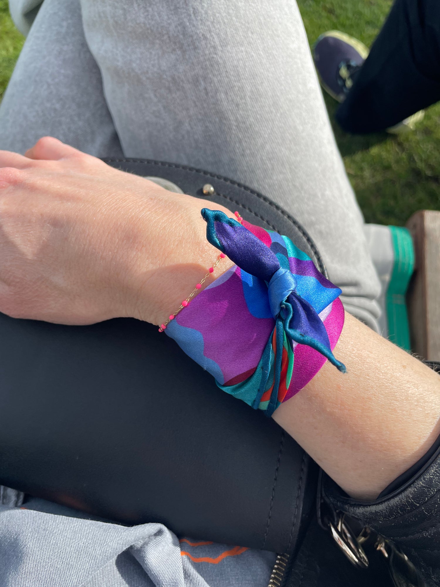 Made from 100% silk satin. Orchid and Fuchsia Pulse Silk Scrunchies are soft, luminous, and endlessly wearable — whether styled in your hair or wrapped around your wrist.